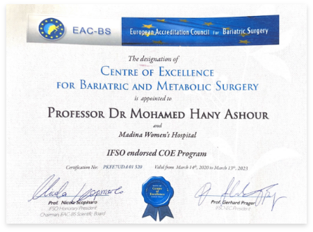 يُعد هذا الاتحاد مؤسسة علمية تجمع بين الجراحين واختصاصي الصحة المتكاملة، مثل الممرضين والممارسين وخبراء التغذية وعلماء النفس واختصاصيي الأمراض الباطنية وأطباء التخدير، وهم يتشاركون جميعاً في علاج المرضى الذين يعانون من السمنة المفرطة. إنه إنجاز آخر يضمه الطبيب إلى لائحة إنجازاته المشرفة، حيث أصبح من القليلين الذين حازوا على لقب “Surgeon OF Excellence”. لا يقتصر الاعتماد من IFSO على المركز فقط، وإنما أيضاً تم اعتماد “مستشفى المدينة للمرأة”، المركز الأوحد المعتمد في مصر، حيث أصبحت”Hospital Bariatric Center Of Excellence by IFSO” ، وهي مقر أغلبية الجراحات التي يقوم بها الطبيب. وهذا يدل على توفر العديد من المؤهلات والخبرات المطلوبة من الجراح والمركز، وهي: